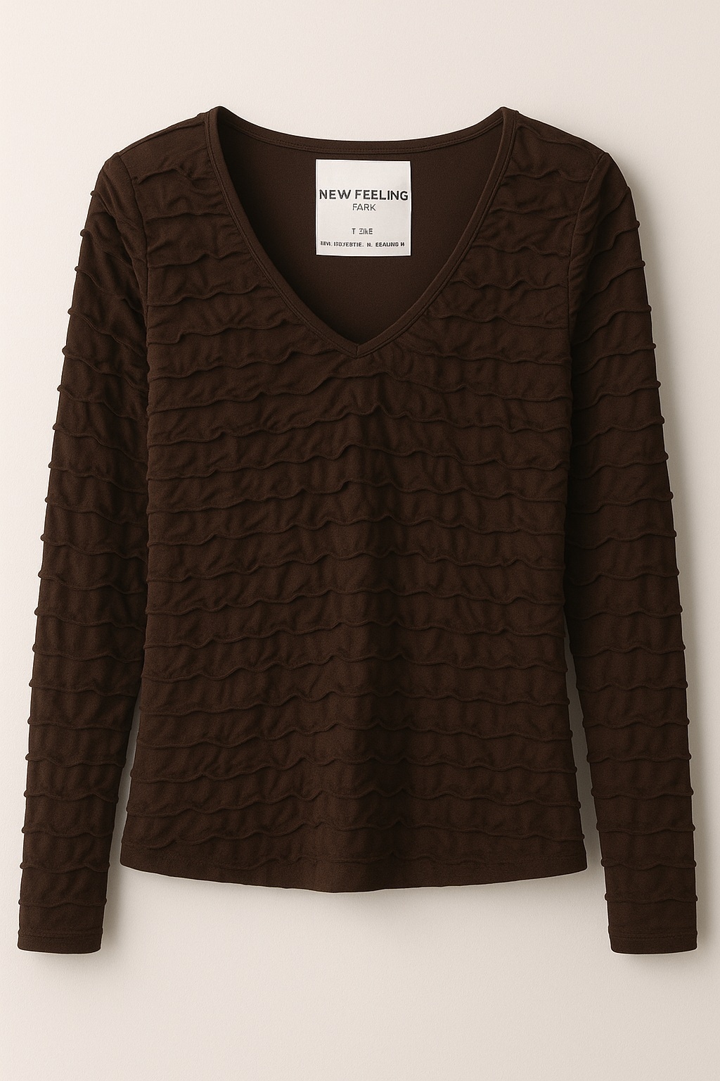 New Feeling Paris - Dames Shirt - Donkerbruin - V-hals - Lange Mouwen - Ruches Allover