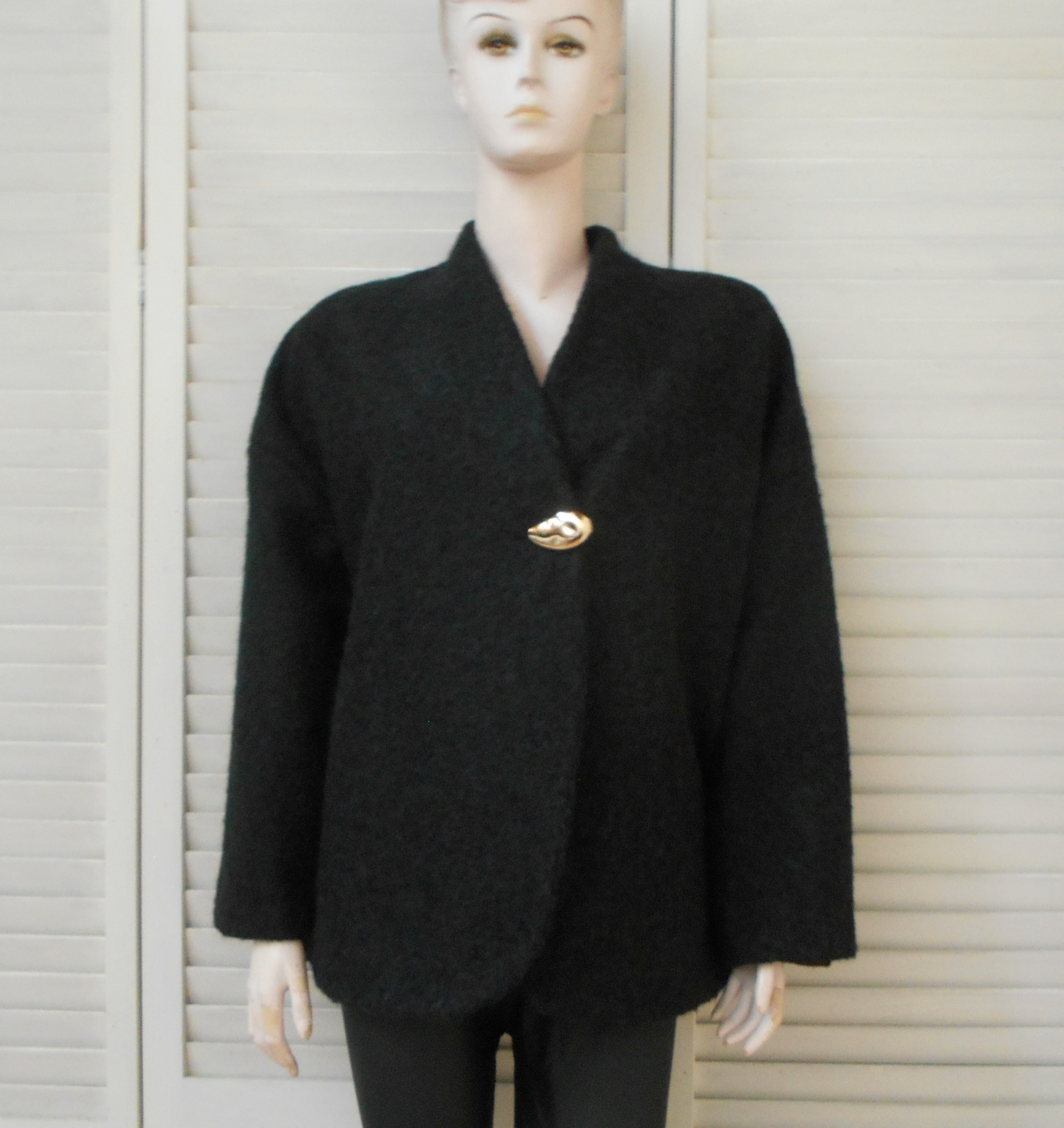 Deze stijlvolle damesjas is uitgevoerd in luxe uni zwarte bouclé en afgewerkt met een opvallende grote gouden knoop voor een chique, hoogwaardige uitstraling. De lichte, gladde voering zorgt voor optimaal draagcomfort, waardoor de jas perfect is voor zowel dagelijks gebruik als speciale gelegenheden.