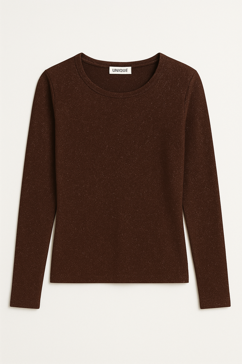 Laat je stralen in dit elegante dames shirt uit onze nieuwe UNIQUE collectie. De diepe bruine glitterkleur geeft elke outfit een chique, feestelijke uitstraling — perfect voor zowel een avondje uit als een stijlvolle alledaagse look.