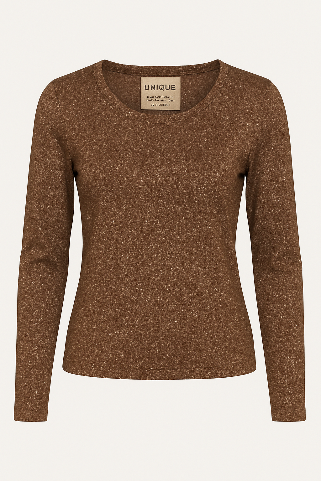 Laat je stralen in dit elegante dames shirt uit onze nieuwe UNIQUE collectie. De diepe khaki glitterkleur geeft elke outfit een chique, feestelijke uitstraling — perfect voor zowel een avondje uit als een stijlvolle alledaagse look.