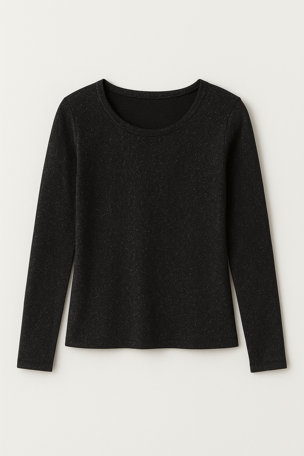 Laat je stralen in dit elegante dames shirt uit onze nieuwe UNIQUE collectie. De diepe zwarte glitterkleur geeft elke outfit een chique, feestelijke uitstraling — perfect voor zowel een avondje uit als een stijlvolle alledaagse look.