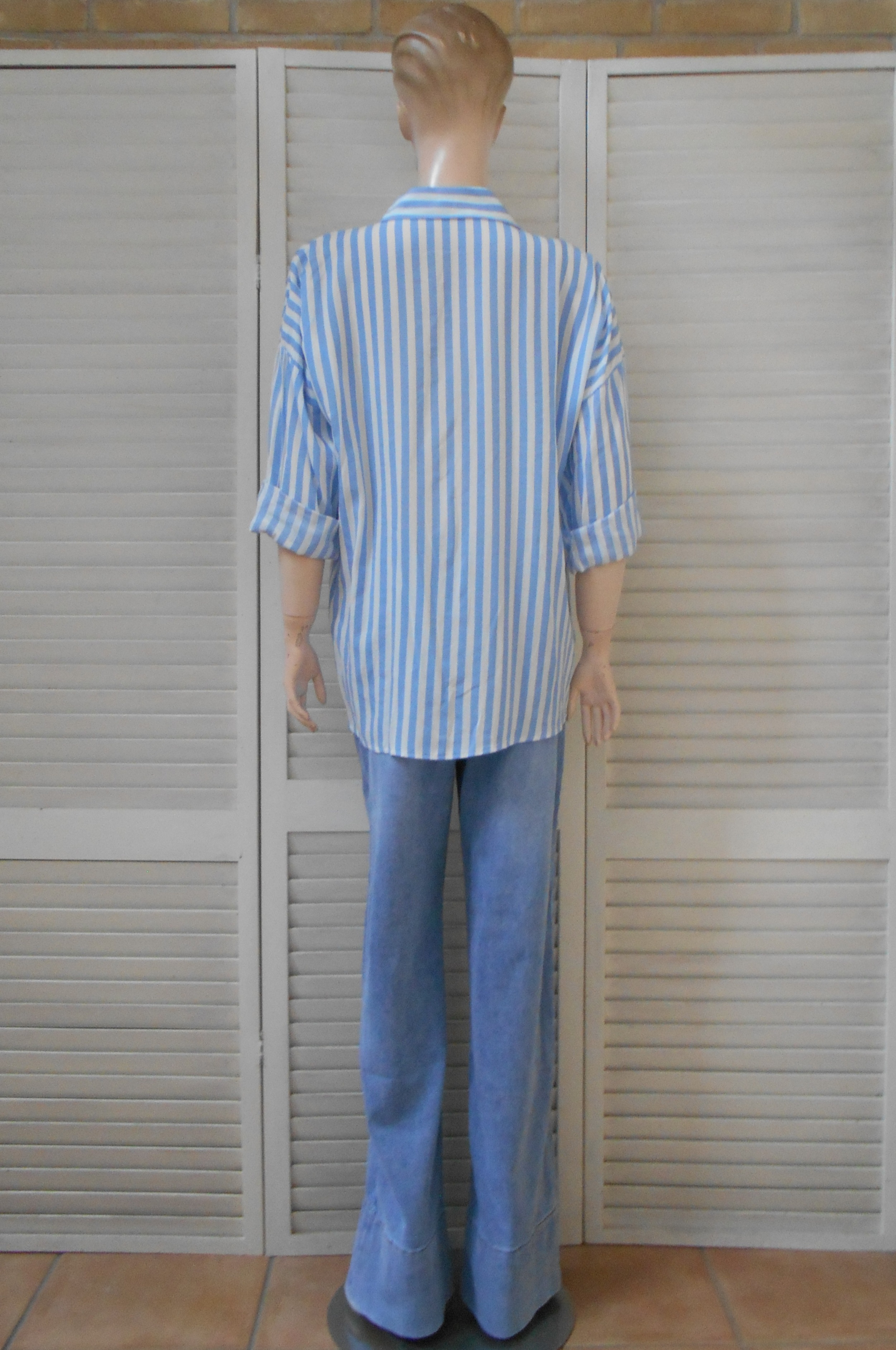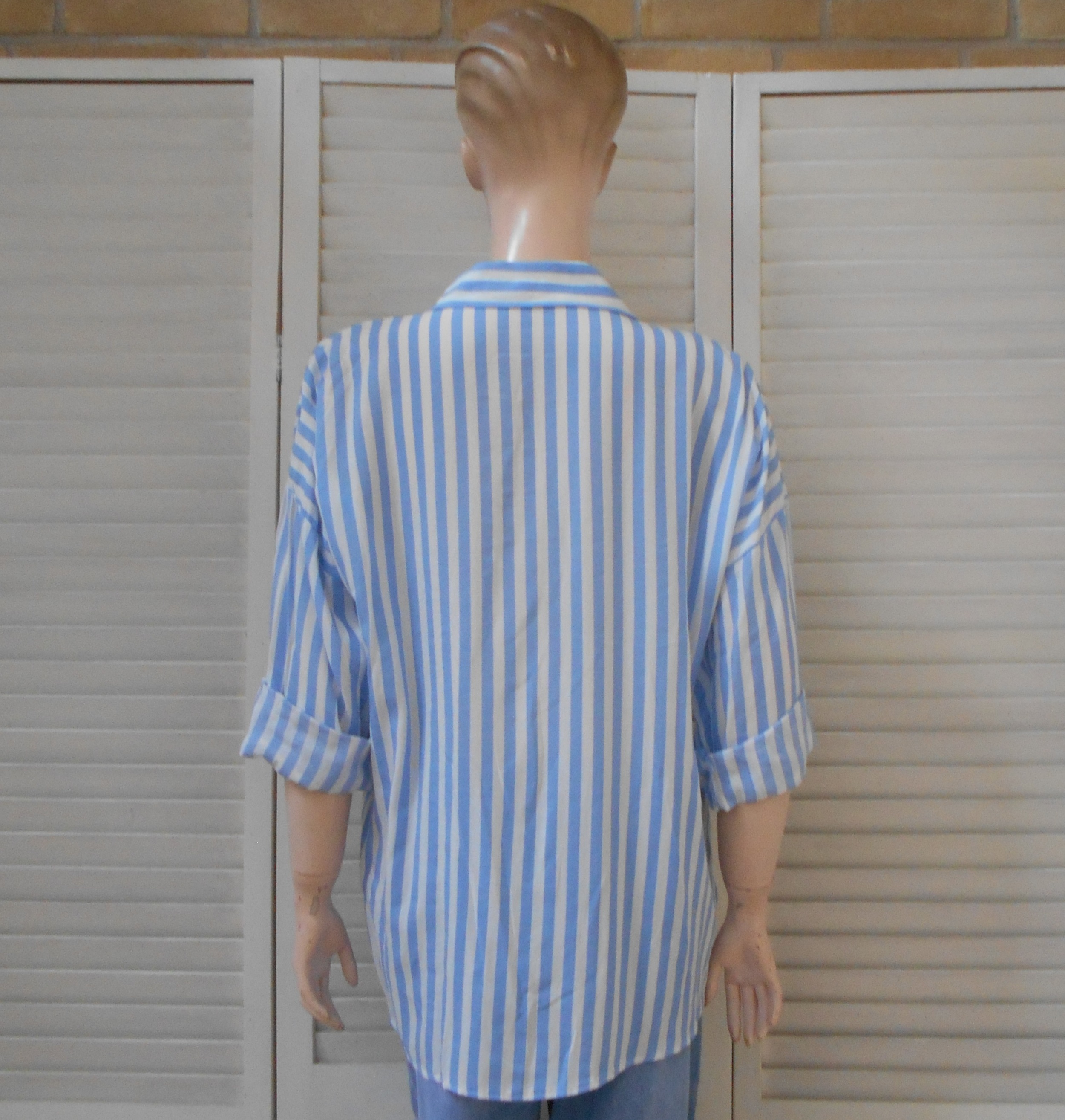 Geef je outfit een frisse, stijlvolle uitstraling met deze elegante damesblouse van Vivi Mode. De blouse is uitgevoerd in een tijdloos lichtblauw / off-white verticaal streepdessin, wat zorgt voor een flatterend en verfijnd silhouet. Het subtiele contrast met het horizontaal gestreepte borstzakje geeft de blouse een speelse, moderne touch.